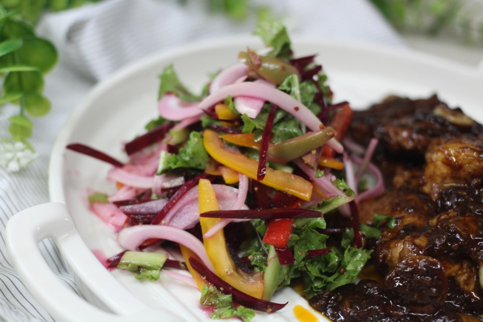 This chicory salad is a burst of freshness, combining the slightly bitter notes of chicory with sweet bell peppers and briny green olives, all tossed in a lively whole grain mustard dressing. A delightful balance of tangy, sweet, and pungent flavors from the vinegar, sugar, and mustard makes it incredibly refreshing. It pairs wonderfully with steak and is so delicious that even a large portion disappears quickly. Enjoy this healthy and vibrant salad!