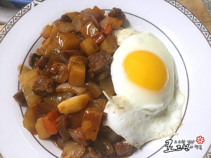 In a separate frying pan, heat a little oil over low heat. Carefully crack the eggs into the pan. Once the egg whites are about half set, turn off the heat and let them cook for another 2 minutes using the residual heat. This will create a perfect runny yolk, sunny-side-up egg. To serve, place a generous portion of hot cooked rice onto a plate. Ladle the rich Hayashi sauce mixture over the rice and top with the freshly fried egg.
