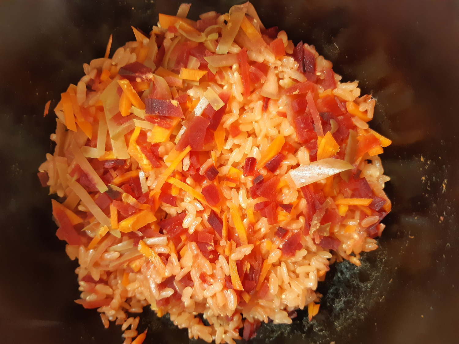 Add the julienned apple peels and the roughly chopped beetroot and carrot to the soaked rice in the rice cooker pot.