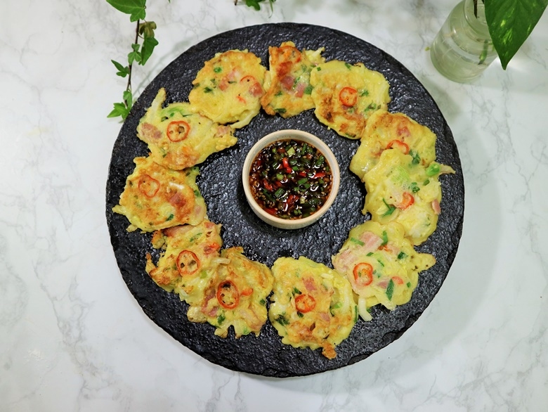 Arrange the well-cooked pancakes attractively on a serving plate. Serve with the prepared dipping sauce on the side.