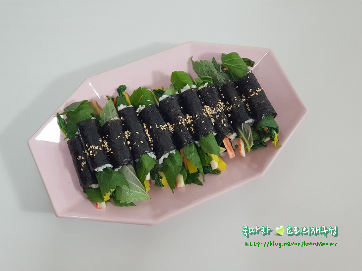Place a small piece of seaweed on a flat surface. Spread a thin, even layer of the seasoned rice over the seaweed. It’s important to spread the rice thinly so the kimbap doesn’t burst when rolled. Place half a perilla leaf on top of the rice to add a fresh aroma. Arrange the pickled radish, spinach, carrots, and imitation crab sticks neatly on top of the perilla leaf. Starting from the edge closest to you, roll the ingredients tightly. Rolling firmly is key to preventing the mini kimbap from falling apart.