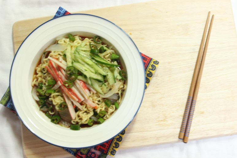 Place the chilled ramen noodles into a serving bowl. Arrange the julienned cucumber and imitation crab meat attractively on top. Pour the prepared special cold ramen sauce over everything. You’ve now created a delicious, spicy, and refreshing cold ramen!