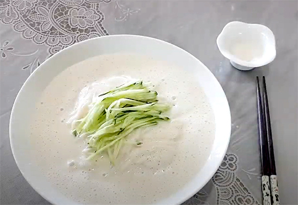 Place the cooked and drained somyeon noodles into a serving bowl. If the soybean broth seems too thick for your liking, add some of the reserved bean-cooking water or cold water to achieve your desired consistency. A few ice cubes can be added for extra coolness.