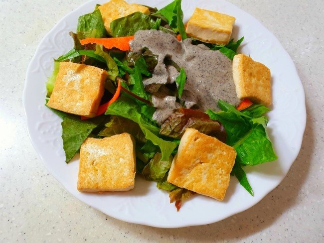 Now, let’s assemble the salad. Arrange the fresh salad greens attractively on a serving plate. Place the golden-brown pan-fried tofu cubes on top of the greens. Finally, generously drizzle the delicious and homemade black sesame sauce over everything to complete your beautiful Black Sesame Tofu and Vegetable Salad!