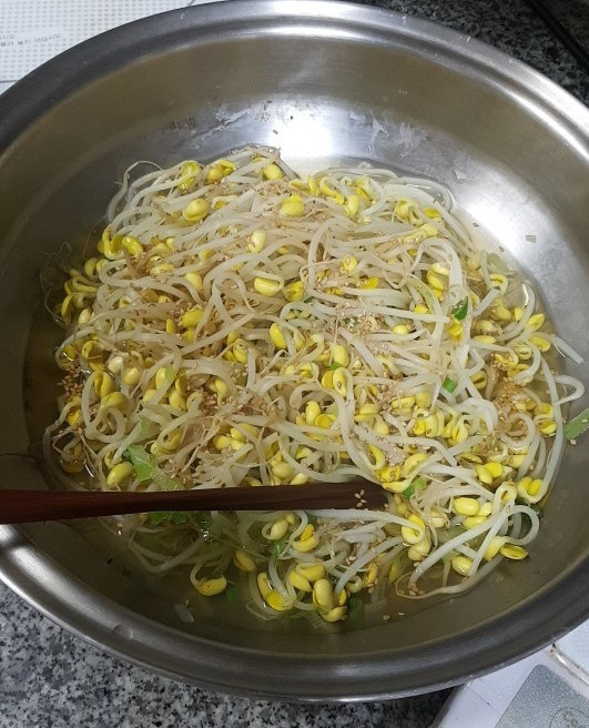 Once the water in the pot starts boiling, open the lid and flip the bean sprouts. (This helps them cook evenly!) Once it boils again, open the lid, add the onion extract (or corn syrup), the sliced green onions, and sprinkle with sesame seeds to finish.
