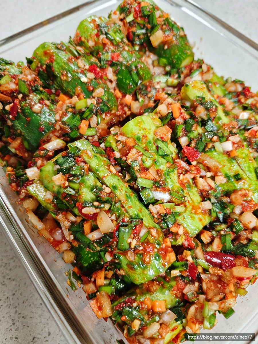 Add the finely blended seasoning to the chopped chives, onion, carrot, and green onions, and mix well to create the filling. Gently remove excess water from the pickled cucumbers. Carefully stuff the prepared filling into the cuts of each cucumber. Press down lightly on each stuffed cucumber to shape it nicely. Finally, arrange the filled Oi Sobagi snugly in an airtight container and let it ferment in a cool place to develop its delicious flavor.