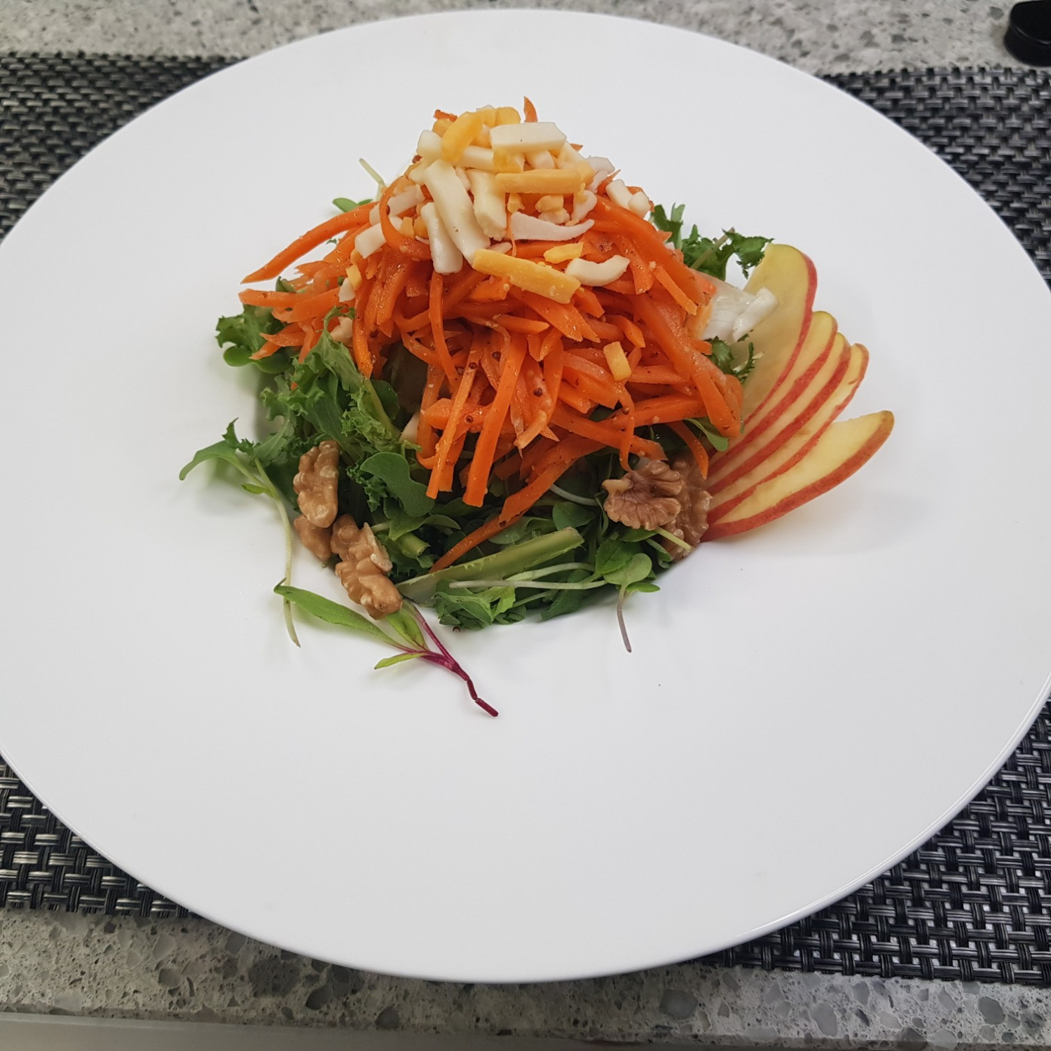 Arrange the prepared mixed greens in a salad bowl. Generously top with the dressed carrot ‘rapée’, followed by the sliced apple, crunchy walnuts, and shredded cheese to finish. Drizzle with any remaining dressing for an extra burst of flavor.