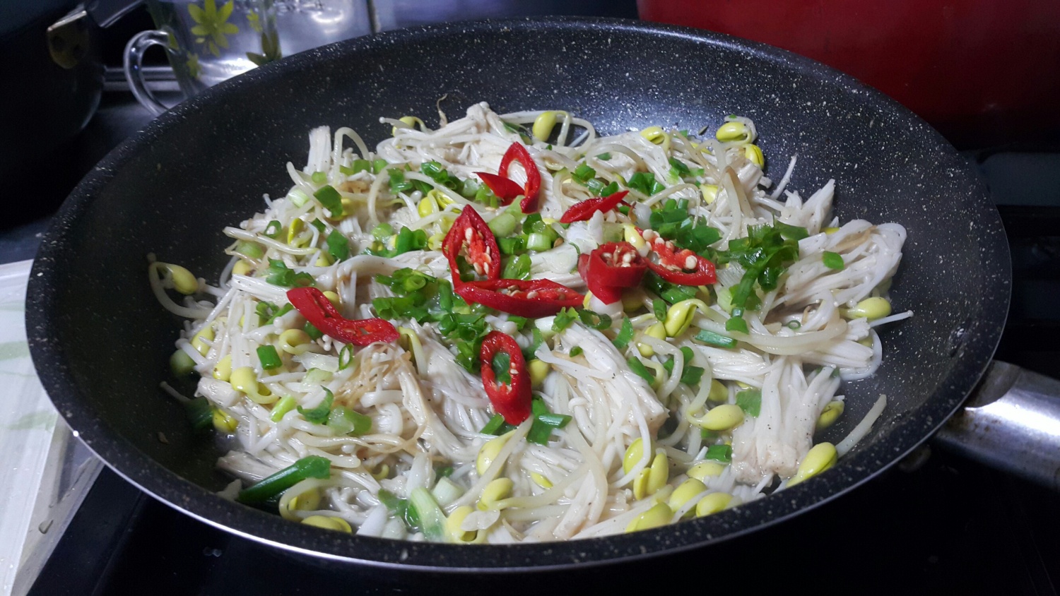 When the bean sprouts are slightly cooked, add the prepared enoki mushrooms and stir-fry together. Enoki mushrooms cook very quickly, so adding them with the bean sprouts is fine. Season with salt and pepper. Adjust the seasoning to your preference.