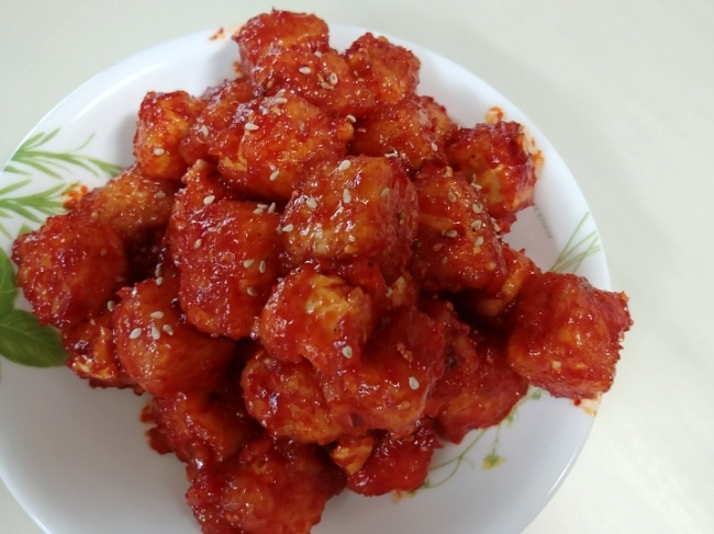 Crispy and Chewy Tofu Gangjeong (Sweet and Spicy Korean Fried Tofu)