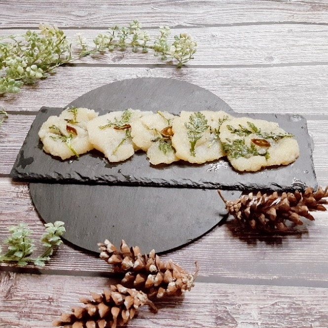 Now, heat a generous amount of cooking oil in a frying pan over medium heat. Scoop about a tablespoon of the potato batter and spread it thinly into a round shape on the pan. For decoration and an extra kick, you can top it with thinly sliced Korean green chili peppers. (Other toppings like crown daisy also look and taste great!)