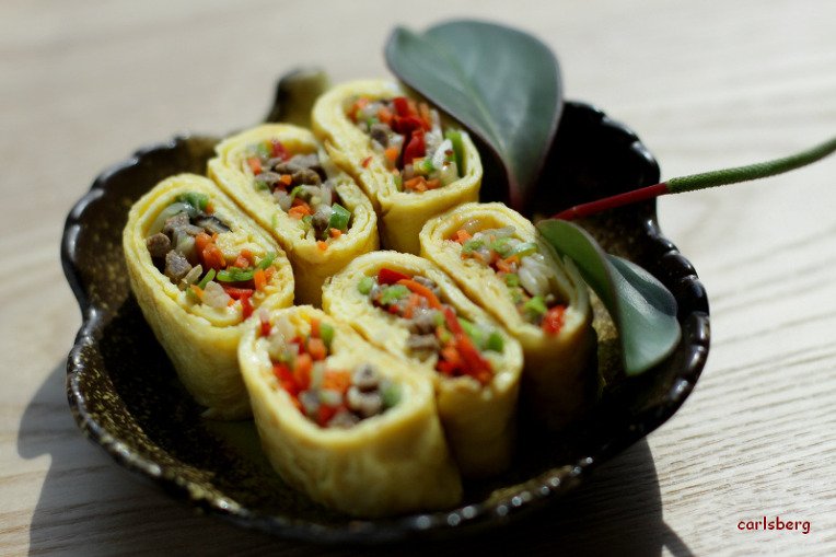 Crack the 8 eggs into a large bowl. Add a pinch of salt and whisk gently with a fork to break the yolks and create a smooth mixture. Lightly oil a heated pan and pour in the whisked egg mixture. Cook over low heat to create a thin omelet (jidan). Once the omelet is cooked, carefully transfer it to a bamboo sushi mat. Arrange the cooked pork and shiitake mushrooms, followed by the prepared vegetables, evenly over the omelet. Using the bamboo mat, roll the omelet tightly, ensuring there are no gaps, to form a compact roll. Rolling it densely is key to achieving a neat shape.
