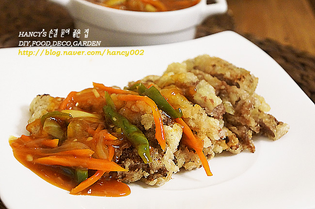 For an enhanced dining experience, pour only half of the sweet, sour, and slightly spicy sauce over the fried Tangsooyook. This method helps maintain the crispiness of the coating while allowing the sauce flavors to permeate. Adjust the amount of sauce to your preference.