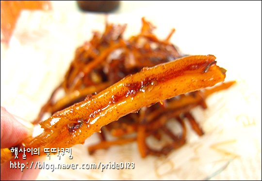 Now, stir the squid with chopsticks over medium-low heat, allowing the seasoning to infuse and cook until golden brown. Cooking slowly over medium-low heat prevents burning and ensures the inside remains moist. When the squid turns a appetizing brown color, just before turning off the heat, sprinkle with grated Parmesan cheese or sesame seeds and mix lightly to finish! This adds a delicious savory aroma. Enjoy!