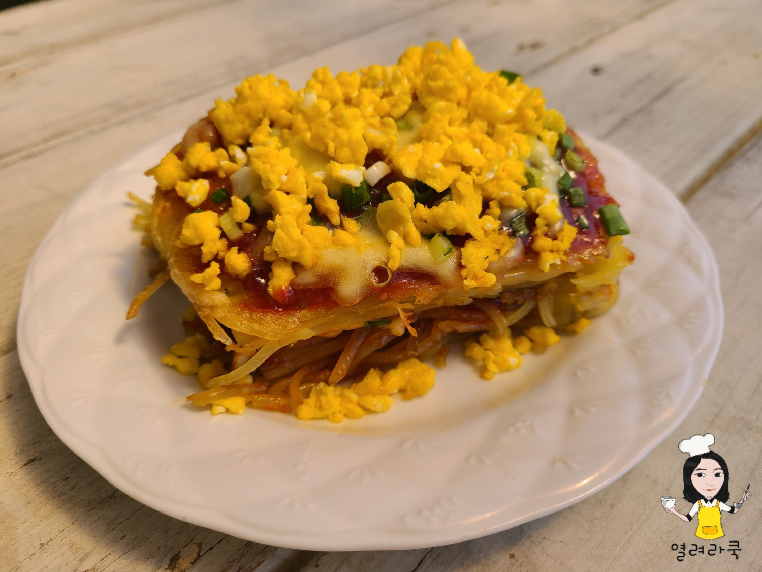 Inspired by a recipe from the Korean show ‘Pyeonstaurant’ by actress Lee Yu Ri, this is my own unique take on the chewy noodle pancake. It’s incredibly simple to make using just one pan and offers a delightful combination of chewy noodles, soft scrambled eggs, a sweet and spicy tteokbokki sauce, and rich mozzarella cheese. Perfect as a quick snack, appetizer, or even a light meal!