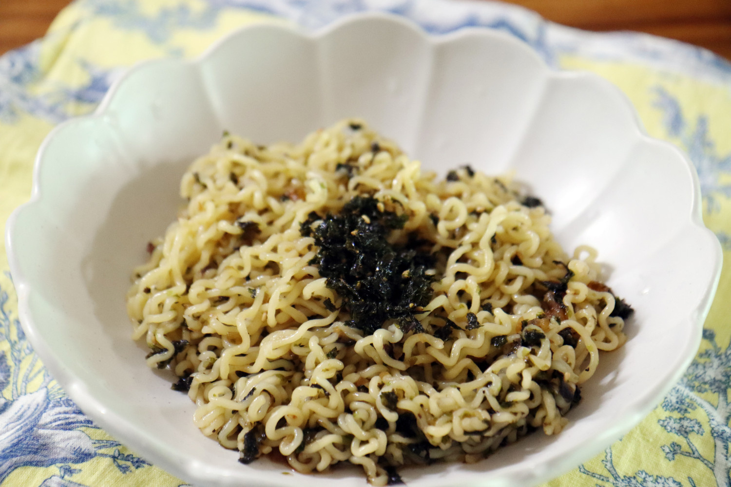 Enjoy this refreshing Gim-Jaban Bibim-ramen. It’s a delightful cold noodle dish perfect for warmer days, combining the savory crispiness of seaweed flakes with a tangy and sweet sauce.