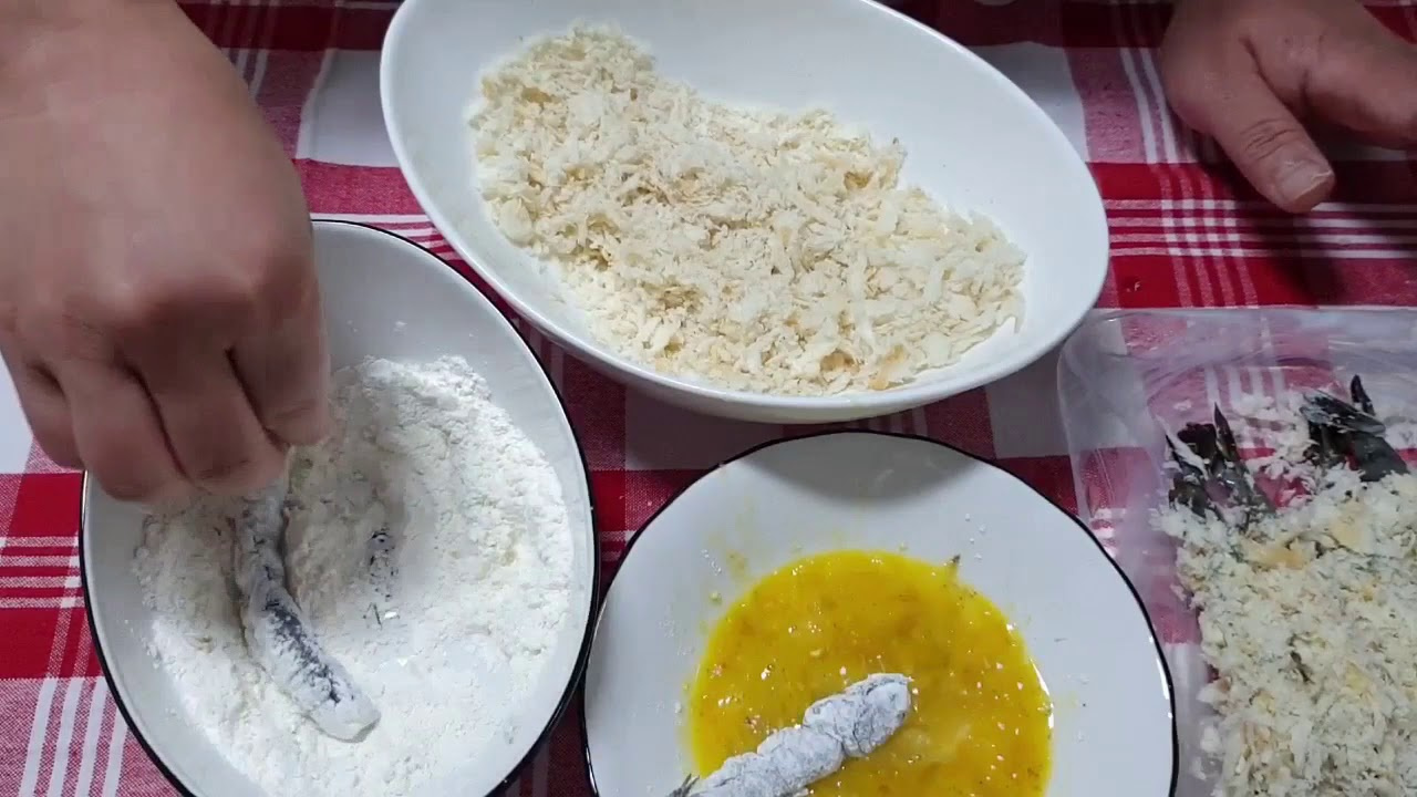 Now, coat the prepared shrimp with the dredging ingredients in sequence. First, lightly dust each shrimp with all-purpose flour, ensuring it’s evenly coated. Gently shake off any excess flour. Next, dip the floured shrimp into the beaten egg mixture, making sure it’s fully covered. Finally, press the shrimp firmly into the panko breadcrumbs, ensuring a thick and even coating. Pressing the breadcrumbs onto the shrimp will help create an extra crispy texture when fried.