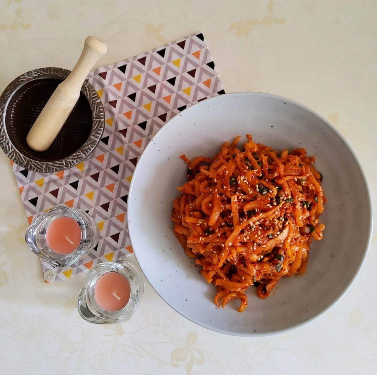 Served over a bowl of warm rice and mixed in, this salad is simply divine. Rekindle your appetite with this fragrant sesame oil-infused pickled radish salad and enjoy a wonderful mealtime!