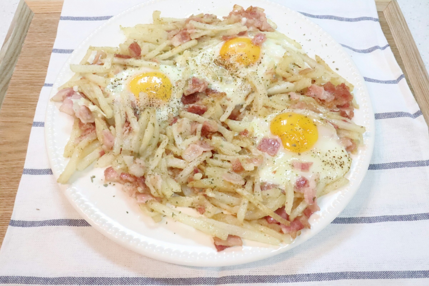 If the potato strings separate during cooking, gently reshape them with a spatula. Once one side is golden and crisp, carefully crack one egg into the empty spaces on top of each pancake.