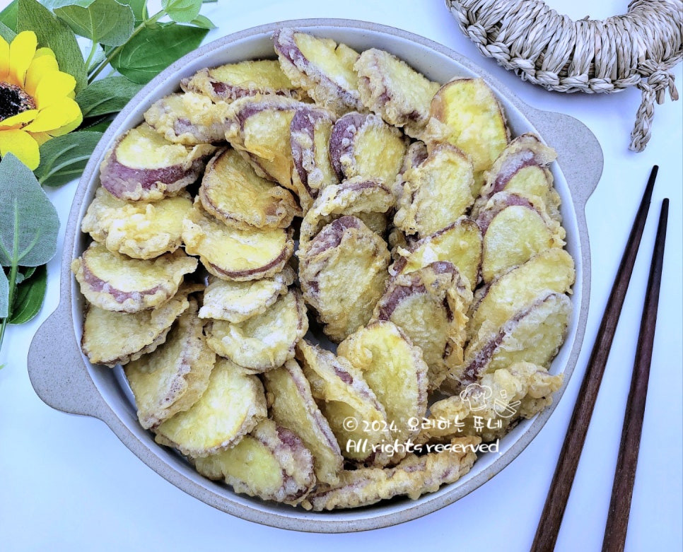 Pour a generous amount of cooking oil into a deep pan and heat over medium heat. To test if the oil is ready, dip a wooden chopstick into it; if small bubbles form around the chopstick, the oil is at the right temperature. Maintain medium heat to avoid burning the coating. Carefully add the battered sweet potato slices one by one, ensuring not to overcrowd the pan. Fry for about 3-4 minutes, flipping them occasionally, until they are golden brown and crispy. You’ll know they’re done when they feel firm and sound crisp when gently tapped with a chopstick. Remove them promptly.