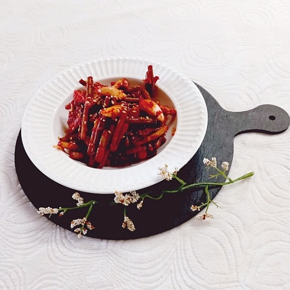 First, prepare about 2 cups of well-pickled garlic scapes. Place the pickled garlic scapes in a bowl. Add 2 teaspoons of gochugaru (Korean chili powder), 1 teaspoon of sugar, 1/2 teaspoon of oligosaccharide, and a pinch of toasted sesame seeds. Gently mix everything together, as if you were lovingly tossing a salad. Ensure the seasonings are evenly distributed. Be careful not to mix too vigorously, as this can bruise the garlic scapes and affect their texture.
