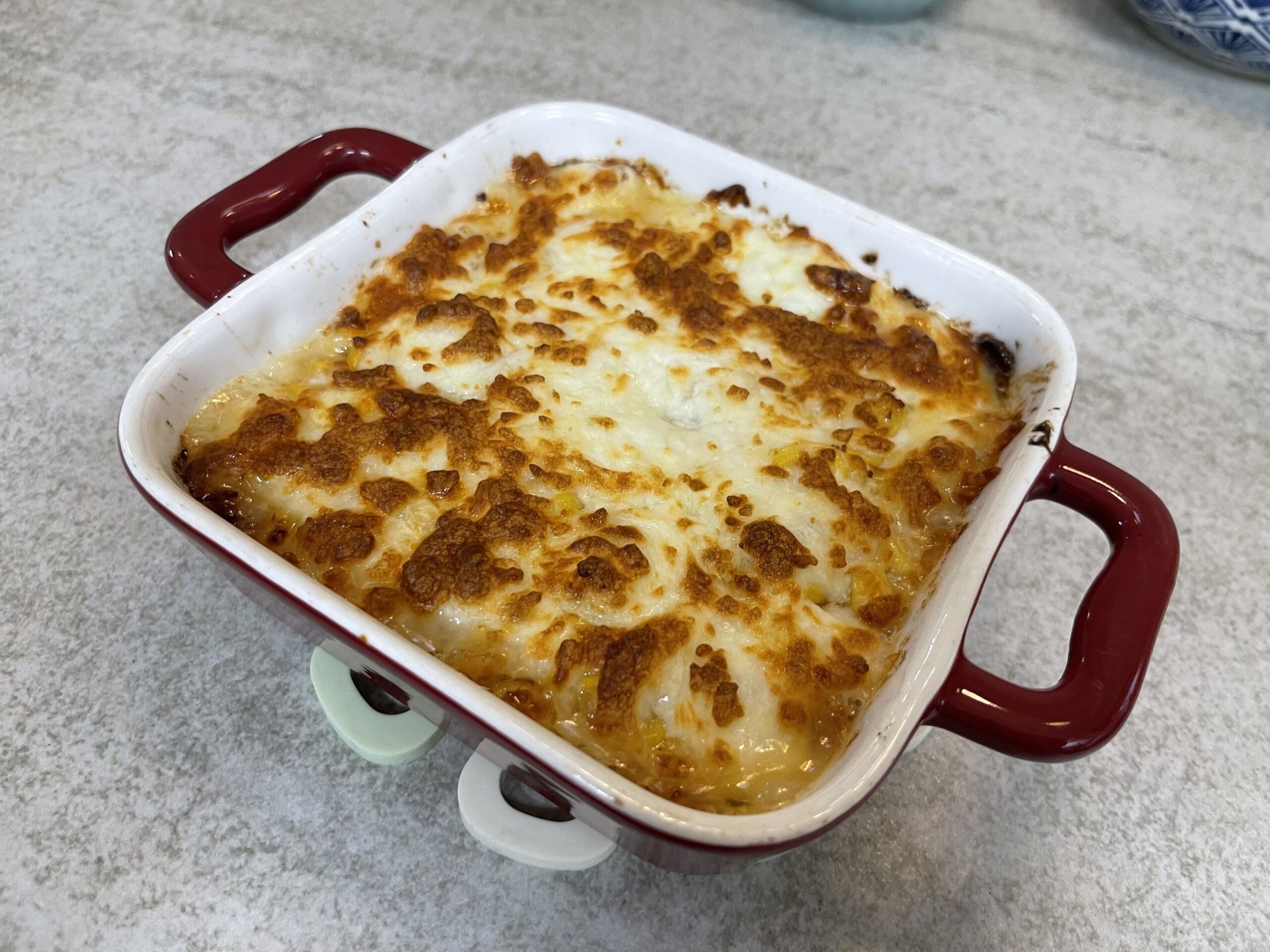 Transfer the well-mixed corn cheese into an oven-safe dish or heat-resistant container for serving. Use a small dish for a single serving or a wider dish if serving multiple people.