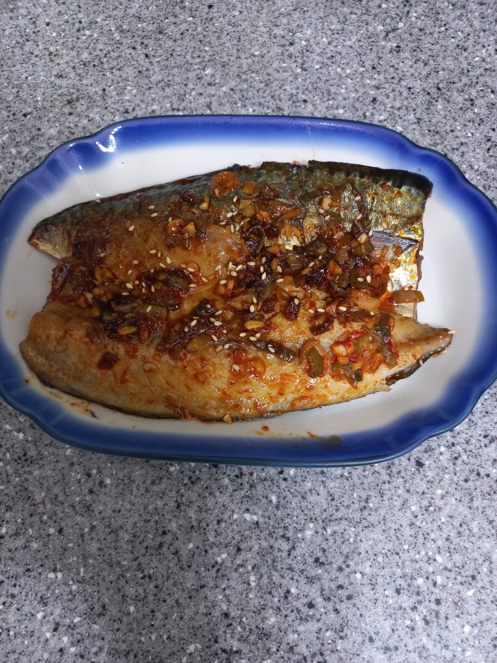 Now, let’s make the special seasoning sauce that will make this grilled mackerel truly shine. In a bowl, combine 1 Tbsp soy sauce, 2 Tbsp mirin, 2 Tbsp vinegar, 1 Tbsp minced garlic, 1 finely chopped chili pepper, 2 Tbsp chopped green onion (white parts), and 1 Tbsp sesame oil. Whisk everything together until well combined. For those who prefer a sweeter taste, feel free to add a pinch of sugar.