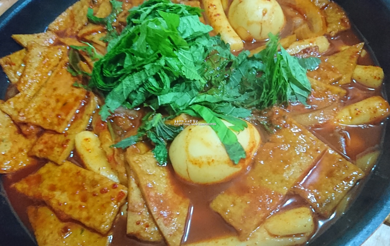 Finally, generously sprinkle the thinly sliced perilla leaves over the finished tteokbokki for garnish. Voila! Your tteokbokki is ready with a mouth-watering appearance. Enjoying it with kimbap made it even more delicious! Enjoy your meal!