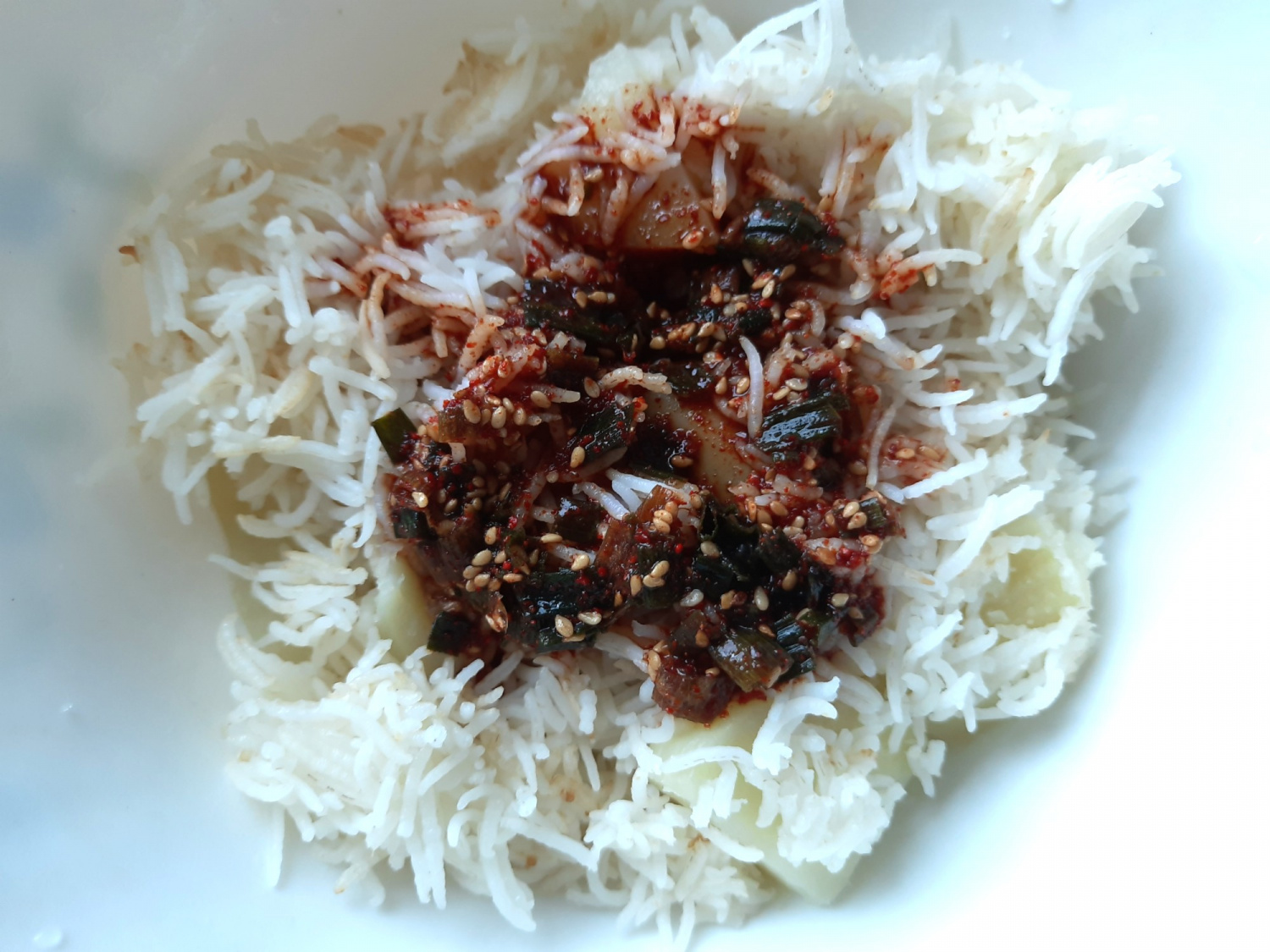 This potato rice is delicious on its own, but it’s even better when mixed with the prepared seasoning sauce. Transfer the hot rice to a large bowl or a traditional Korean mixing bowl (yangpyun). Add the desired amount of seasoning sauce and gently mix, being careful not to mash the rice grains. Enjoy this delightful meal!