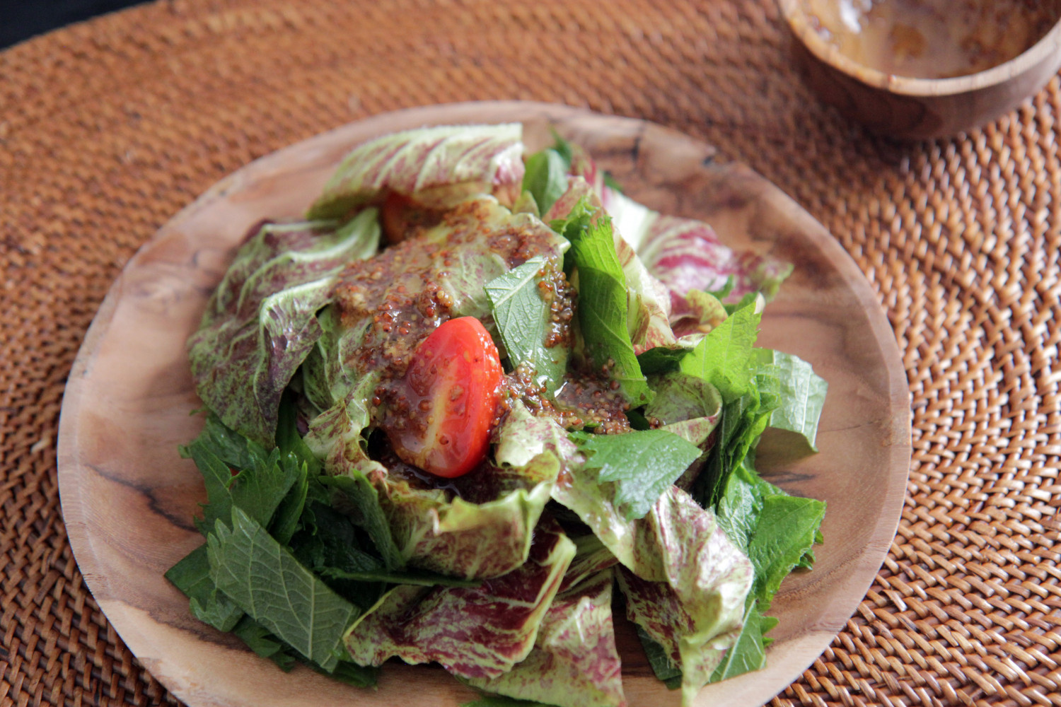Arrange the prepared perilla leaves (or shiso), halved cherry tomatoes, and salad greens attractively in a large salad bowl. Drizzle the freshly made dressing over the top just before serving. For an extra touch, consider adding nuts or cheese to your taste.