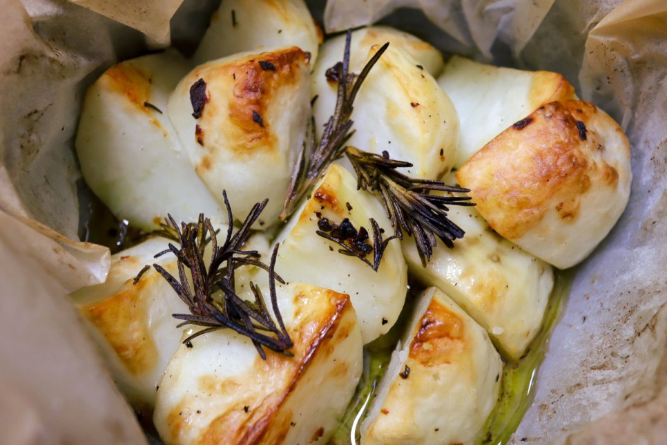 Spread the seasoned potatoes in a single layer on the baking pan. Place them in a preheated oven at 230°C (450°F) and roast for 30 to 40 minutes, or until golden brown and tender. Cooking time may vary depending on potato size and oven type.