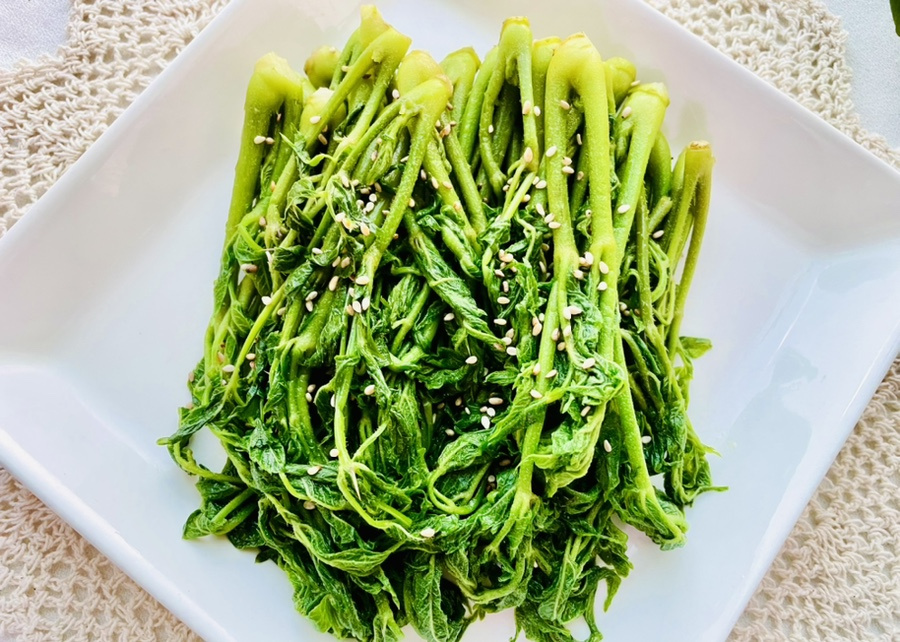 Second Seasoning and Finishing: Finally, add 1 tablespoon of sesame oil and 1/2 tablespoon of toasted sesame seeds. Gently mix again. Crushing the sesame seeds before adding can enhance their nutty aroma. Enjoy your delicious seasoned fatsia shoots!