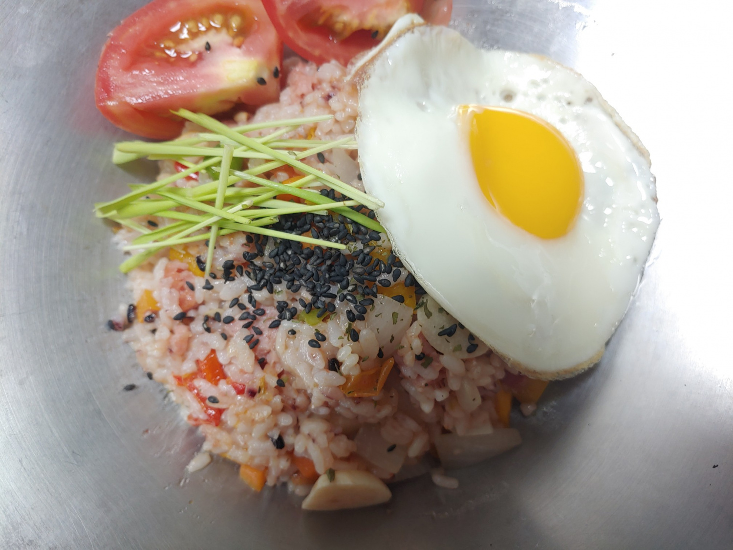 For an extra touch, prepare a sunny-side-up egg. Breaking the yolk and mixing it with the fried rice will make it even richer and more delicious.