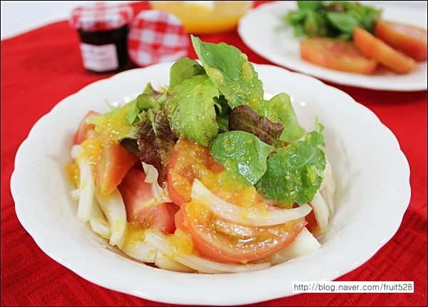 Now, let’s prepare the delicious kumquat dressing! In a blender, combine about 10 kumquats (washed and stemmed), 100ml of orange juice, 1 tablespoon of olive oil, and 3 tablespoons of fresh lemon juice. Blend until smooth and well combined, creating a vibrant and fragrant dressing. In a large bowl, place the prepared tomatoes and drained onion. Add about two-thirds of the kumquat dressing and toss gently to coat. You can adjust the amount of dressing to your preference. Arrange the dressed tomatoes and onion on a serving plate. Finally, top with the fresh baby greens and drizzle with the remaining dressing. Your nutritious and flavorful Tomato Kumquat Dressing Salad is now ready to be enjoyed!