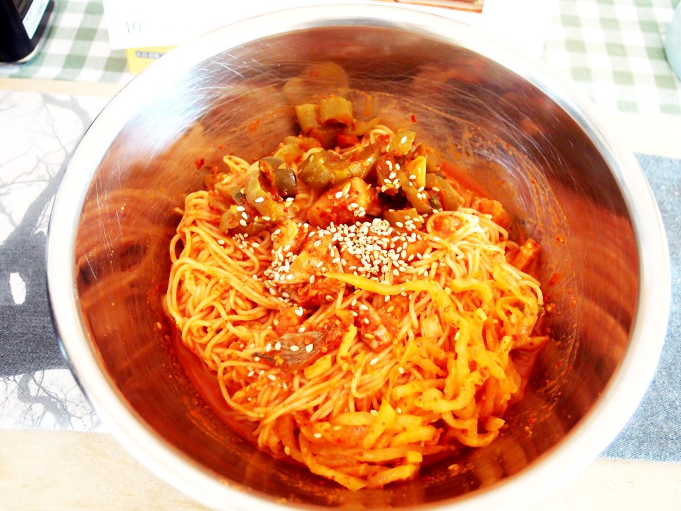 Finally, use chopsticks to thoroughly mix all the ingredients together. Enjoy the delightful combination of textures – the crispness of the pickled radish, the slight chewiness of the cucumber salad, and the distinct, savory depth of the Gajami Sikhye. This satisfying blend creates a truly unique and delicious noodle dish!