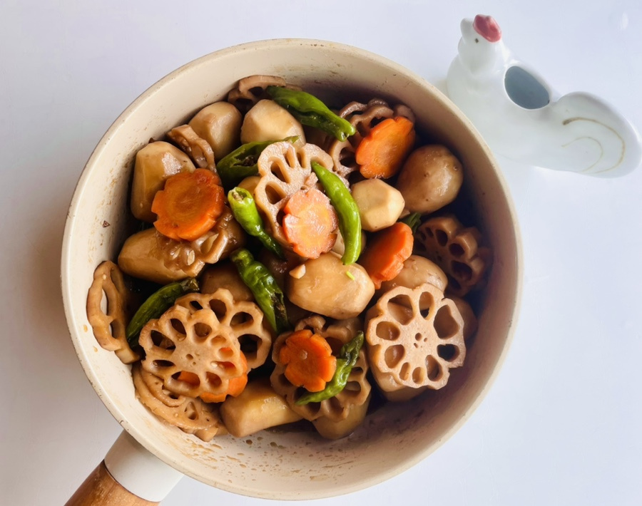 This braised dish incorporates seasonal autumn vegetables like lotus root and carrots, along with aromatic snap peas. Slicing the round taro and lotus root, colorful carrots, and snap peas into pretty flower shapes and stir-frying them together not only makes the dish visually appealing but also enhances its flavor. The base is a sweet and savory Sukiyaki soy sauce, inspired by Japanese home cooking, but you can substitute it with Tsuyu or regular seasoned soy sauce if needed.