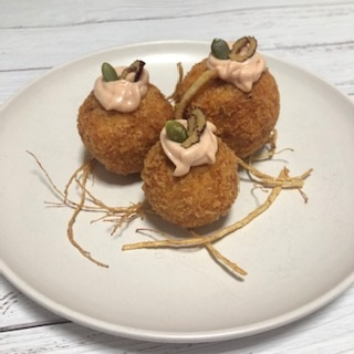 Arrange the finished Ginseng EAT Chicken Croquettes on a serving plate. Garnish with the fried ginseng rootlets and dried jujube slices. Serve with the prepared pink sauce on the side. Enjoy your delicious, homemade croquettes!