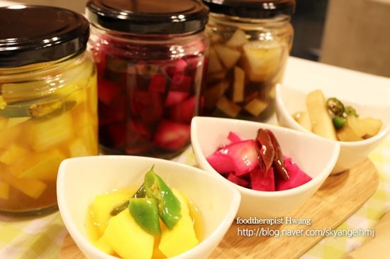 A common characteristic of people with poor digestion is low stomach acid. Persimmon vinegar is excellent for replenishing stomach acid. Wondering how to enjoy persimmon vinegar deliciously, I came up with the idea of making beautiful, yellow pickles using turmeric powder, which is known to be beneficial for the brain. These pickles offer a delightful blend of flavors and health benefits.