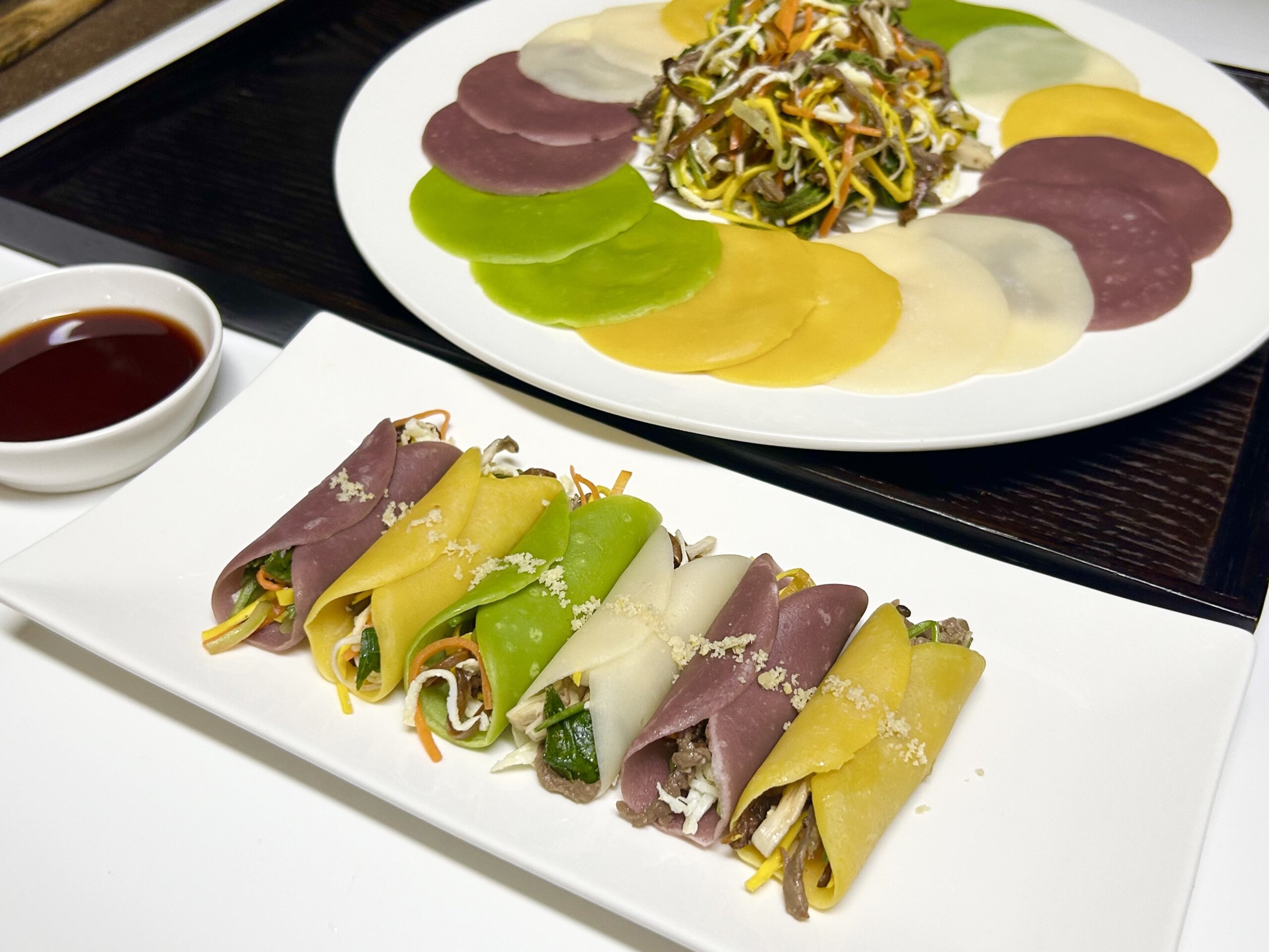 Place a crepe in the center of a serving plate. Arrange the prepared fillings attractively around the crepe. The fragrant chwinamul from Yangpyeong harmonizes wonderfully with the mushrooms and beef, creating a fantastic aroma. The variety of colors and textures will delight both your eyes and palate!