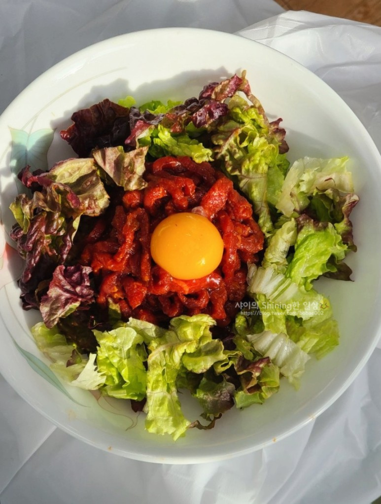 Time to assemble your bibimbap! 1) Start by spreading a bowl of warm cooked rice evenly at the bottom of your serving dish. 2) Next, arrange the prepared lettuce leaves over the rice, covering it well. 3) Make a slight indentation in the center of the ingredients to create a small well for the egg yolk. 4) Finally, carefully place the gochujang-marinated yukhoe on top of the lettuce and gently nestle the egg yolk into the center well. Your delicious Yukhoe Bibimbap is ready to be enjoyed!