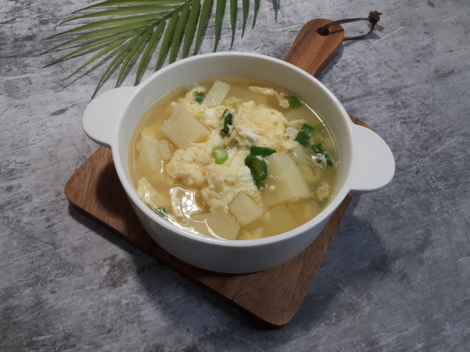 Ladle the finished Potato and Egg Soup into serving bowls. Enjoy this warm and comforting soup with a side of rice!