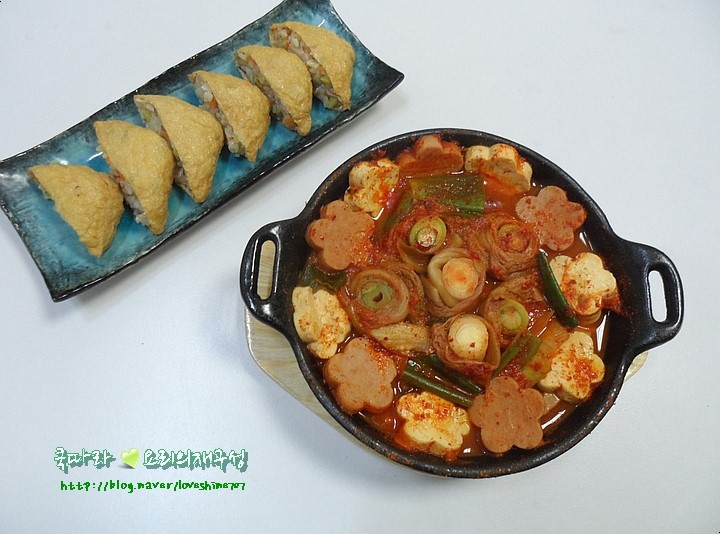 Arrange the sliced Spam and tofu around the edges of the pot. If you cut out flower shapes, place them attractively on top, alternating between Spam and tofu. (If diced, arrange them around the kimchi rolls.)