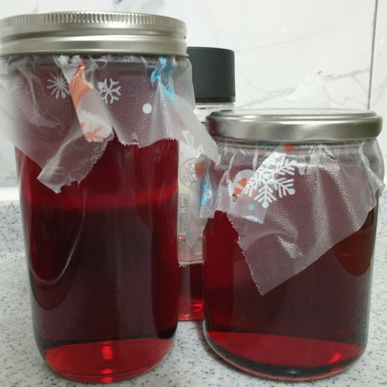 It’s crucial to use glass or food-grade plastic containers, as stainless steel can react with the Omija’s compounds and alter its quality. Place the washed dried Omija berries into your chosen container and pour in 2L of cold, fresh water. Let the berries steep to release their flavor and color. The steeping time varies by season. The recommended times from my Omija packaging were 10 hours for summer and 24 hours for winter. You can use this as a guideline, but ensure the water has developed a rich, deep color.