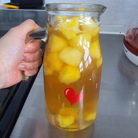Pour the sugar-vinegar mixture over the pineapple in the jar, ensuring the pineapple is well-covered. Seal the jar and let it sit at room temperature, away from direct sunlight, for about 2 weeks. During this time, the pineapple will infuse the vinegar with its delicious flavor. After 2 weeks, your homemade pineapple vinegar will be ready! To enjoy, dilute it with water at a 1:5 ratio (vinegar to water). You can adjust the sweetness by adding a touch of honey if desired. Enjoy this refreshing and healthy drink!