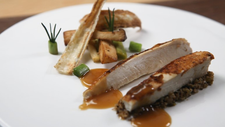 Arrange the seared chicken breast steak on a serving plate. Complement it with the pan-seared king oyster mushrooms, the crispy fried burdock root, and perhaps some fresh greens or the prepared relish.