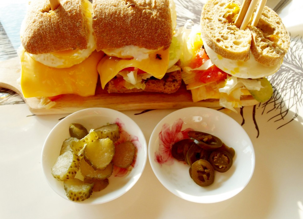 First, slice the ciabatta bread in half horizontally. Then, fry 3 eggs to your preferred doneness (sunny-side up is recommended for a runny yolk) to be used as a topping for the burger.