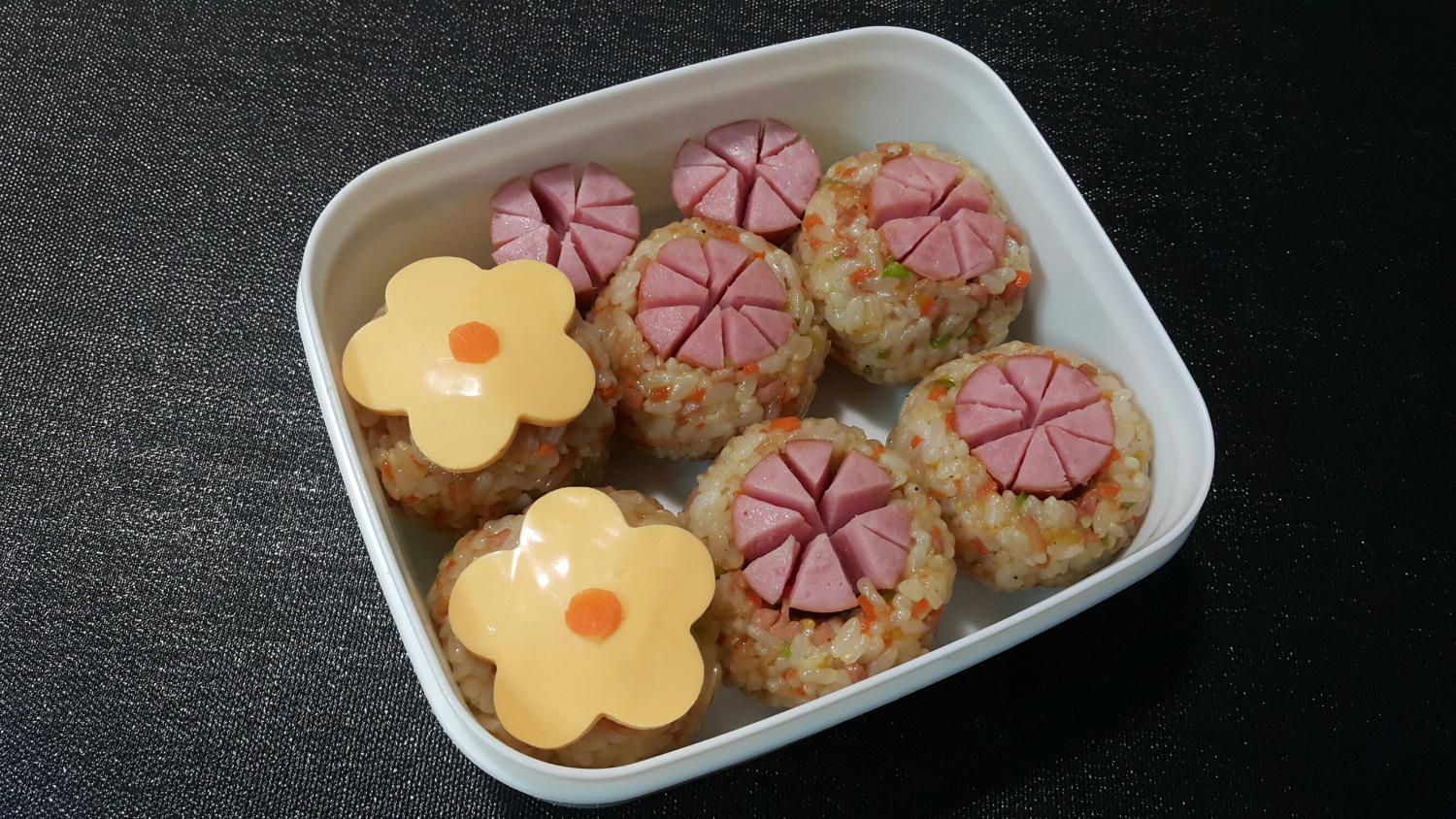 Take portions of the rice mixture and shape them into flat, round patties using your hands or plastic wrap. Place one of the prepared flower-shaped ham sausages on top of each patty. Then, carefully shape the rice around the ham to form a complete round rice ball, resembling a flower. Arrange them beautifully in your lunchbox for a delightful spring picnic treat!
