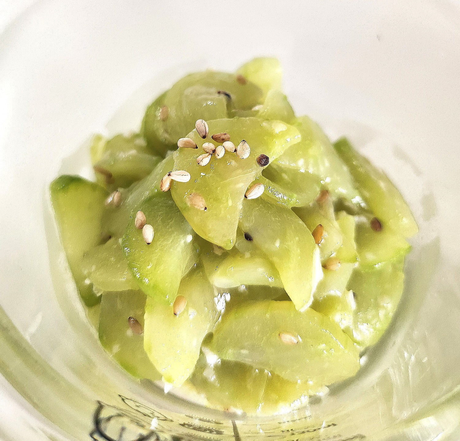 Increase the heat to high and quickly stir-fry the cucumber for about 2 minutes, or until it starts to turn slightly translucent. Avoid overcooking, as the cucumber should retain a crisp texture. Quickly stir in 0.5 tsp of sesame oil and a pinch of sesame seeds, stir-frying for just a few more seconds to finish.