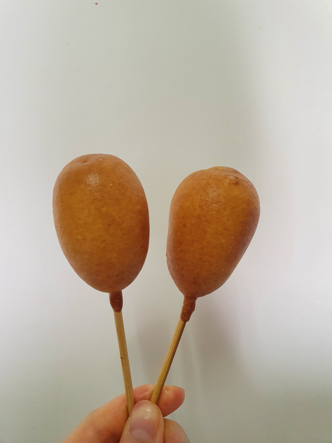 Time to fry! Heat enough cooking oil in a pot to about 170-180°C (340-350°F). You can test the oil temperature by dropping a tiny bit of batter in; it should sizzle and float to the surface immediately. Carefully lower the battered sausages into the hot oil. Hold them steady with your skewer for a few seconds until the batter sets slightly, then gently rotate them to ensure even browning. Fry until they are a beautiful golden brown and crispy. This happens quickly, so watch them closely to prevent burning! Serve immediately while warm, with ketchup for dipping. Enjoy your homemade mini hot dogs!