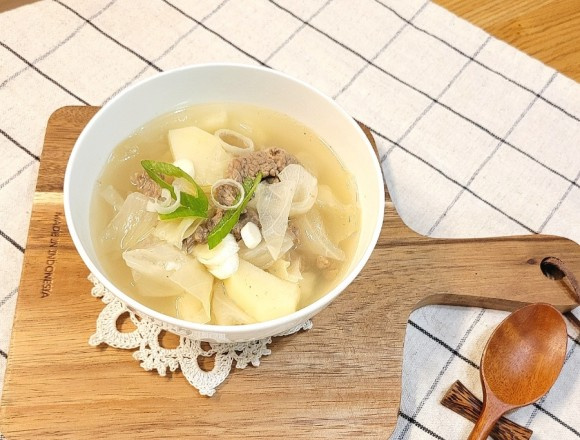 This isn’t your typical restaurant beef and radish soup. It’s a taste of my childhood, made with my mother’s recipe. While it looks similar to beef and radish soup, the generous amount of cabbage makes it wonderfully sweet. I’ve recreated my mom’s recipe from memory. ^^