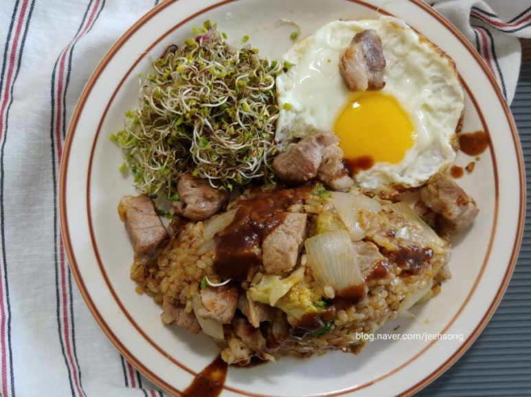 Transfer the finished curry fried rice to a serving plate. Top with a fried egg (preferably sunny-side up) and a handful of fresh sprouts for added color and texture. Drizzle with steak sauce or a touch of balsamic glaze, if desired, for an extra layer of flavor. Enjoy your delicious meal!